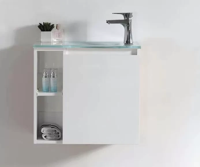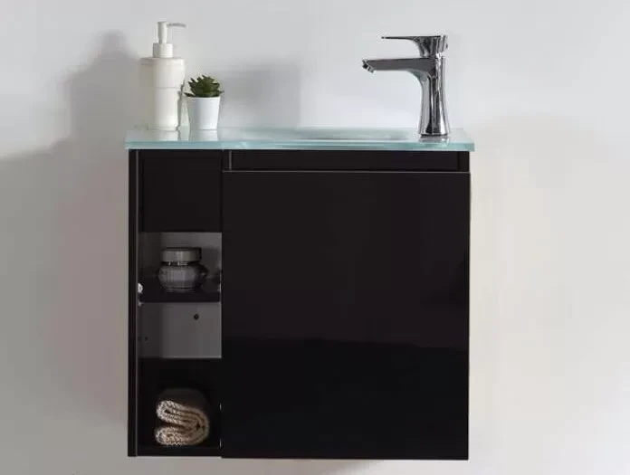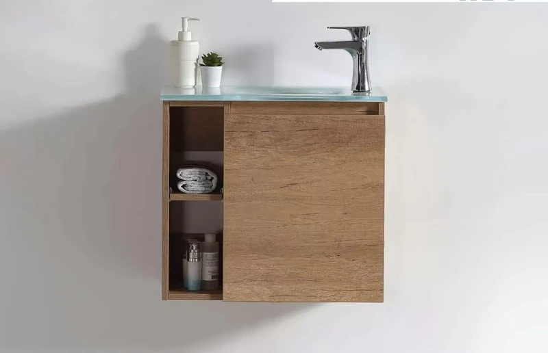 דלת טריקה שקטה + כיור זכוכית אינטגרלי + מראה קריסטל בלגי מרחפת + תאים פתוחים.